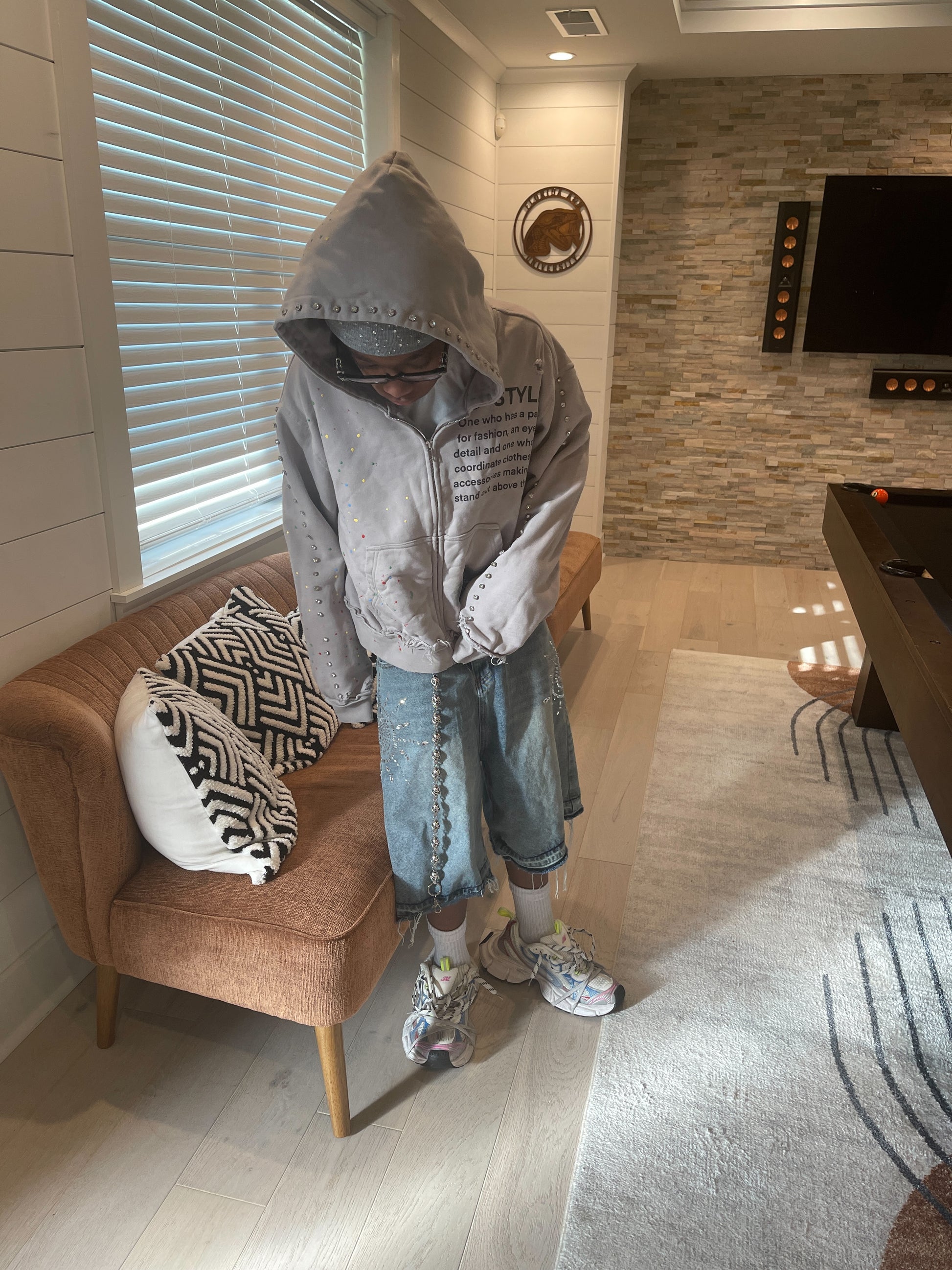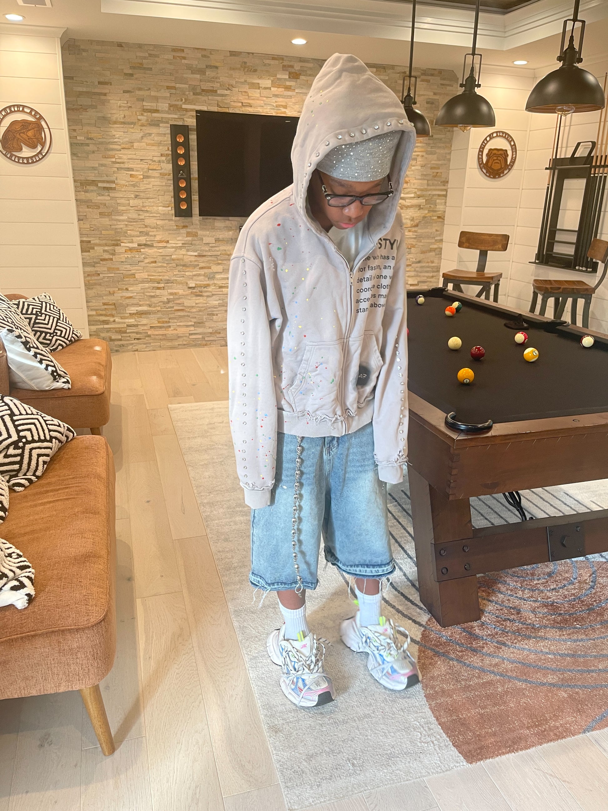 Our “Nostylist Paint Splatter Zip Up” is a 450 GSM, breathable, zip up. Consisting of screen printed designs, a paint splatter effect, and embroidery rhinestones. This zip up is top quality. (Model is 5’5 wearing a Small)